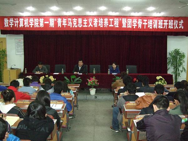 为了进一步坚定全院学生的理想信念,于3月24日下午3点半,数学计算机学院第一期“青年马克思主义者培养工程”暨团学骨干培训班在B区主楼二楼报告厅举行开班典礼。学院党总支副书记戴兴安老师、学生工作办公室余洁老师、团委书记蔡正云老师、09级辅导员邓箴老师及学生会分团委、各班班团委员参加了会议,余洁老师主持开班仪式。