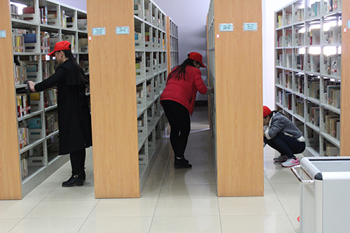本次活动的主要内容是帮助图书馆工作人员整理图书、擦拭书架、桌子以及清扫地面卫生。为了提高工作效率,大家分团队打扫,每十人一队,每一队一层。队列中男生负责打水,搬运图书、报刊杂志,女生负责整理图书、擦拭书架。志愿者们不顾书架上的灰尘是否弄脏自己的手掌和衣服,凭借着“学雷锋”志愿者的精神和青年人的热情,仅用两个小时的时间就圆满完成任务,为图书馆营造了干净舒适的读书学习环境。