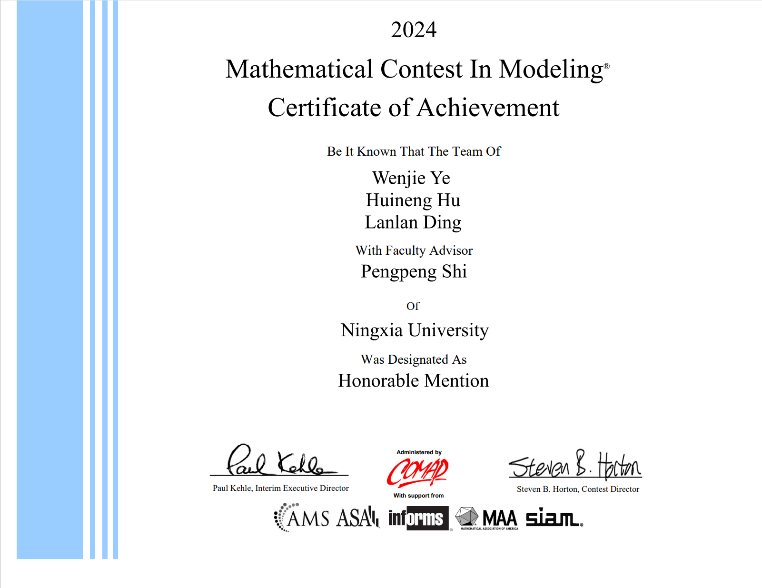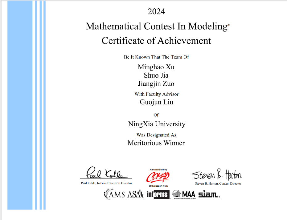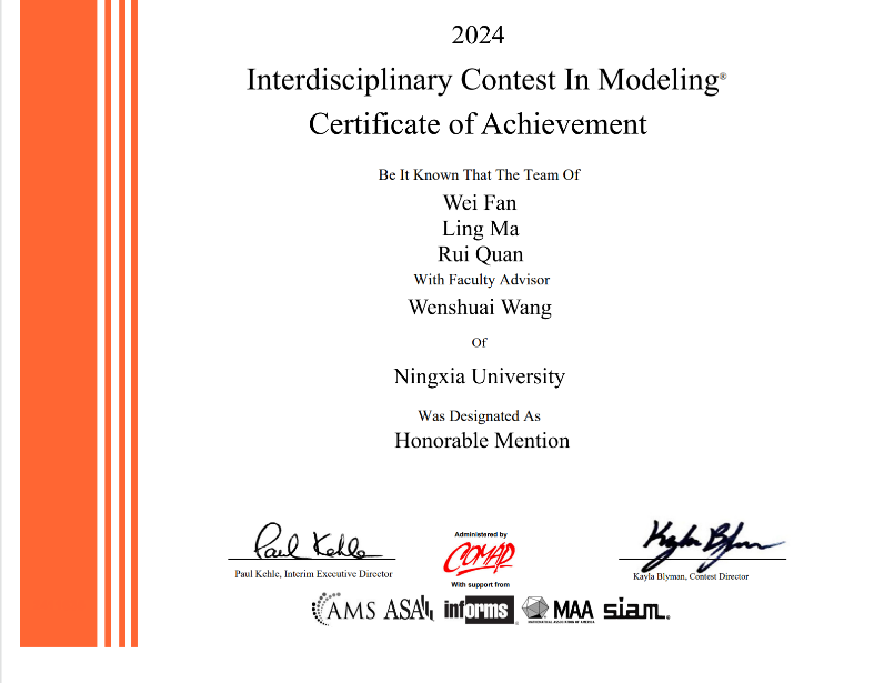 近日,2024年国际(美国)大学生数学建模竞赛(MCM/ICM)成绩揭晓,williamhill英国喜获佳绩。本届竞赛我院获M奖(一等奖)1项,H奖(二等奖)2项。获奖数量和质量均创历史新高。