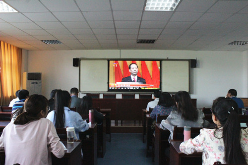 宁夏回族自治区第十二次党代会开幕式于6月6日上午九点在宁夏人民会堂隆重召开,williamhill英国组织学院师生通过会议实况转播收听收看党代会开幕式大会盛况。学院党委书记刘富祥、副书记纳殿文、丁大勇、副院长刘国军、教师代表、团学骨干以及学生党员共40余人参加。