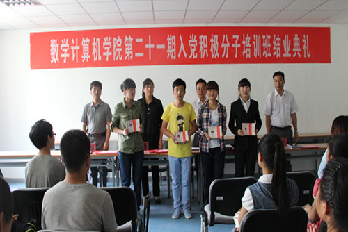 在神圣庄严的国歌声中后,学员代表陈丽华做了交流发言。她表示党课的学习使学员们受益匪浅,更加坚定了他们要以实际行动加入到中国共产党的决心。接着,院领导为本次通过学习和考试,成绩合格的学员们颁发了结业证书。韩惠丽宣读了《数学计算机学院关于表彰第二十一期入党积极分子培训班优秀学员的决定》后,院领导们又为优秀学员颁发了荣誉证书及奖品。