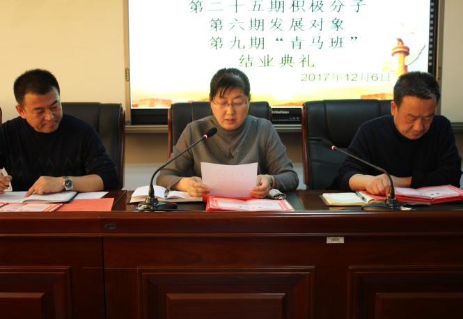 2017年12月6日下午两点,我院全体入党积极分子、部分发展对象及部分青马班学员于学院楼413教室参加第二十五期入党积极分子、第六期发展对象、第九期“青马班”结业典礼。出席此次会议的有学院党委书记刘富祥老师、学院院长韩惠丽老师,学院党委副书记丁大勇老师、纳殿文老师、学院副院长刘国军老师、汪文帅老师以及学院党支部书记陶佳玲老师以及16级、17级辅导员王惠方老师、刘璐老师。此次会议由学院党委副书记纳殿文老师主持。