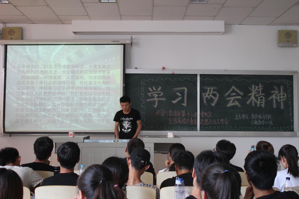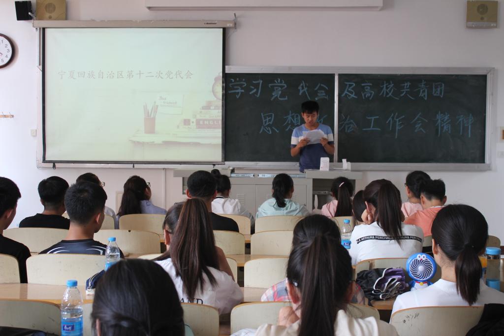 活动开始,全体同学起立并齐唱国歌。接着活动主持人为大家介绍了《中国共产党宁夏回族自治区第十二次党代会》召开的时间及地点,并带领同学们一起学习大会报告。自治区党委书记石泰峰同志代表中共宁夏回族自治区第十一届委员会所作的报告,高举中国特色社会主义伟大旗帜,深入贯彻习近平总书记系列重要讲话精神,通篇贯穿了习近平总书记视察宁夏时的重要讲话精神。大会号召全区各级党组织、广大共产党员和各族人民要更加紧密地团结在以习近平同志为核心的党中央周围,高举中国特色社会主义伟大旗帜,为实现经济繁荣、民族团结、环境优美、人民富裕,与全国同步建设成全面小康社会目标而努力奋斗。最后,同学们又一起学习全国高校共青团思想政治工作会会议精神,并展开讨论,同学们表示一定要结合自治区第十二次党代会的报告和全国高校共青团思想政治工作会会议精神,努力学习,积极实践,争取做一名合格的共青团员,为宁夏的发展尽自己的一份绵薄之力。