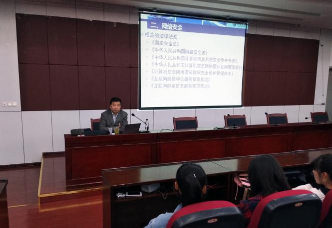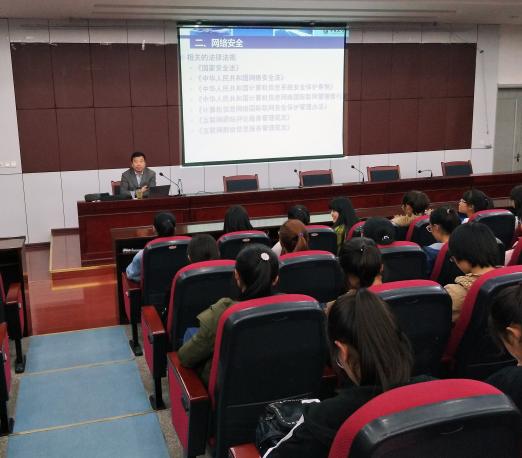 为增强我院新生网络安全意识,提高学生安全防范能力,10月16日晚七点,我院特邀网管中心主任杨军老师在怀远校区研究生楼二楼报告厅为2017级新生开展了网络文明与安全知识专题讲座。