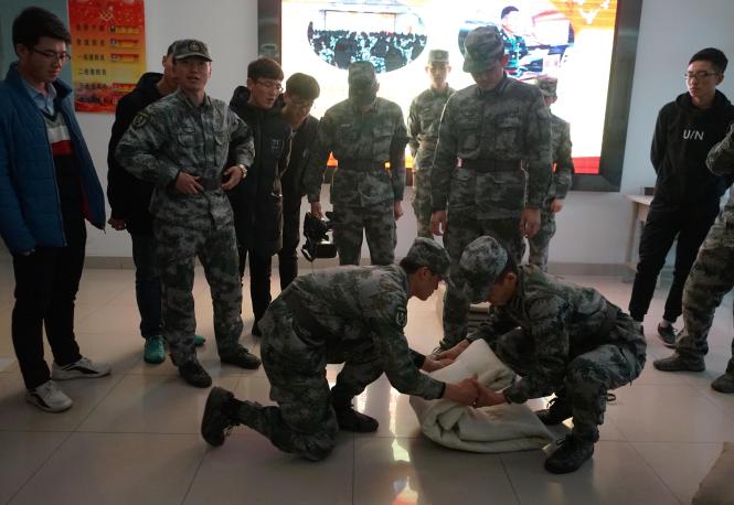 首先,国防生们带领同学们参观了枪械库、战备库、应急装备器材室、仪仗队器材室等,使同学们了解国防生日常训练及生活情况的同时也明白了他们肩上所扛的重大责任,敬佩之情油然而生。在一楼大厅,国防生为同学们示范了叠被子与打背包,使同学们明白每一块棱角分明的被子、每一个整齐紧凑的背包,都要用十分的精力来完成,更让同学们深刻意识到国防生日常生活的高标准与严要求。在此期间,陶老师亲切地询问了国防生们日常生活的方方面面,同学们也在他们的对话中了解到了国防生们异于常人的艰苦的大学生活,而这群铁骨少年却用他们坚强的笑容告诉同学们要不怕吃苦、迎难而上。走近国防生宿舍,他们的每一样东西都摆放的有规有矩,同学们也认真地进行了学习。参观结束后,大家在国防生楼前拍照留念。