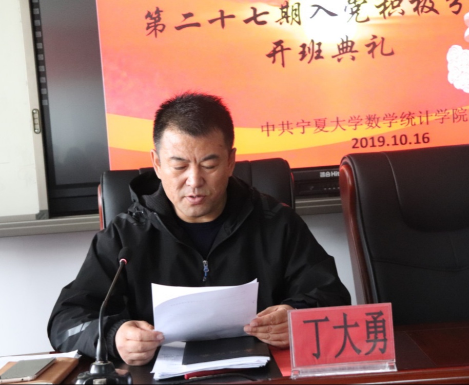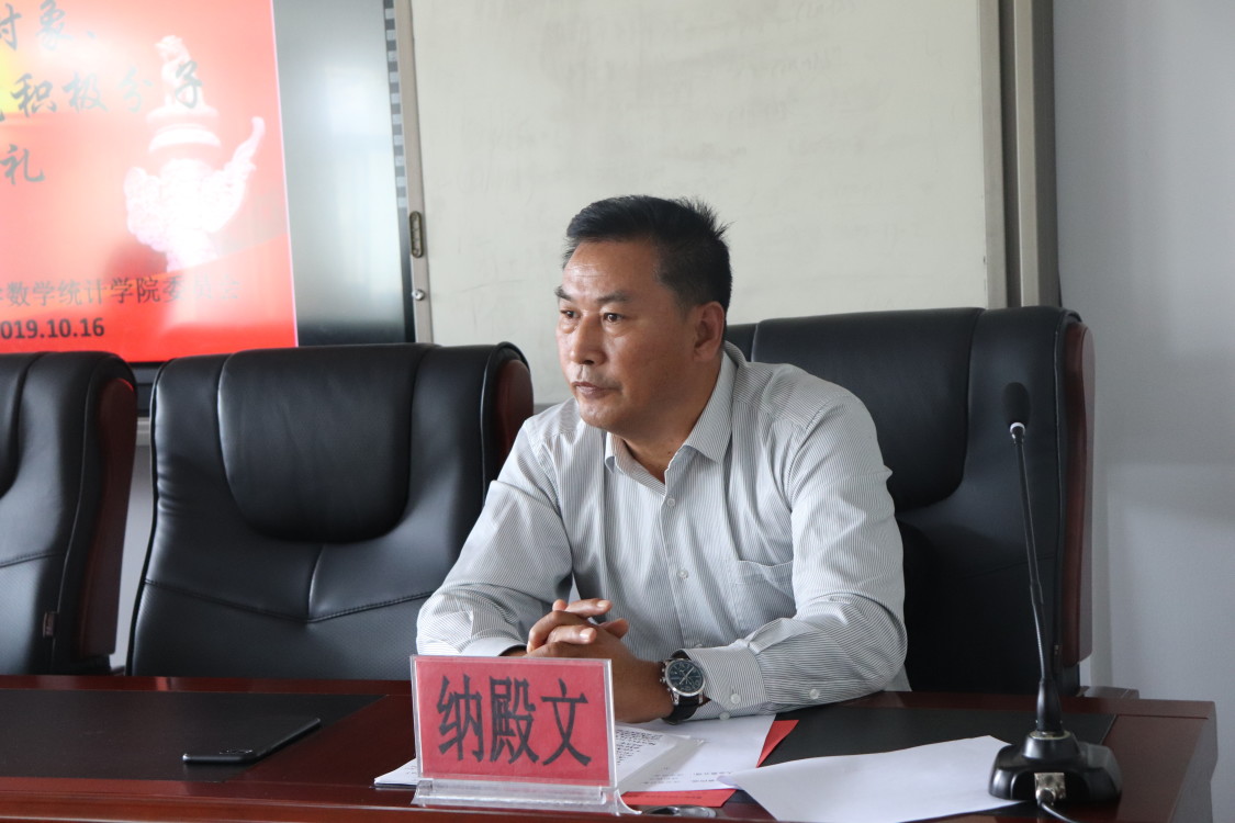 为了帮助我院学生进一步掌握党的相关理论知识,提高综合素质,切实保证入党积极分子和发展党员的质量,提高党的战斗力,2019年10月16日中午12时40分,williamhill英国于怀远校区宁远楼413会议室举行第十期发展对象与第二十七期入党积极分子培训班开班典礼。本次典礼由学院党委副书记纳殿文老师主持,学院党委书记刘富祥老师、学院党委副书记丁大勇老师、学院副院长刘国军老师、李风军老师、学院团委书记、学生工作办公室主任陶佳玲老师及数学综合党支部书记刘璐老师出席,全体第十期发展对象成员及第二十七期入党积极分子参加。