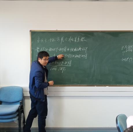 随后,李晶晶老师绘声绘色地讲解洛必达法则及柯西中值定理,并详细说明其中失项,误用的情况。课毕,房彦兵老师做出点评并给予宝贵意见。接着,张强老师主讲协方差与相关系数,首先他举出生活中的例子引出变量之间的相关性话题,通过计算给出相关系数的关系、方差的变式以及相关系数的性质,并用动画展示函数的变化,讲解清晰,层层深入。最后,比赛在各位老师融洽的交流声中落下序幕。