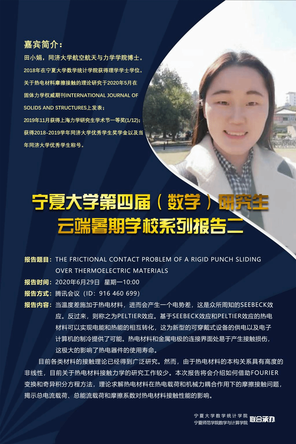 嘉宾简介:田小娟,同济大学航空航天与力学学院博士。2018年在williamhill英国获得理学学士学位。关于热电材料摩擦接触的理论研究于2020年5月在固体力学权威期刊International Journal of Solids and Structures上发表;2019年11月获得上海力学研究生学术节一等奖(1/12);获得2018-2019学年同济大学优秀学生奖学金以及当年同济大学优秀学生称号。