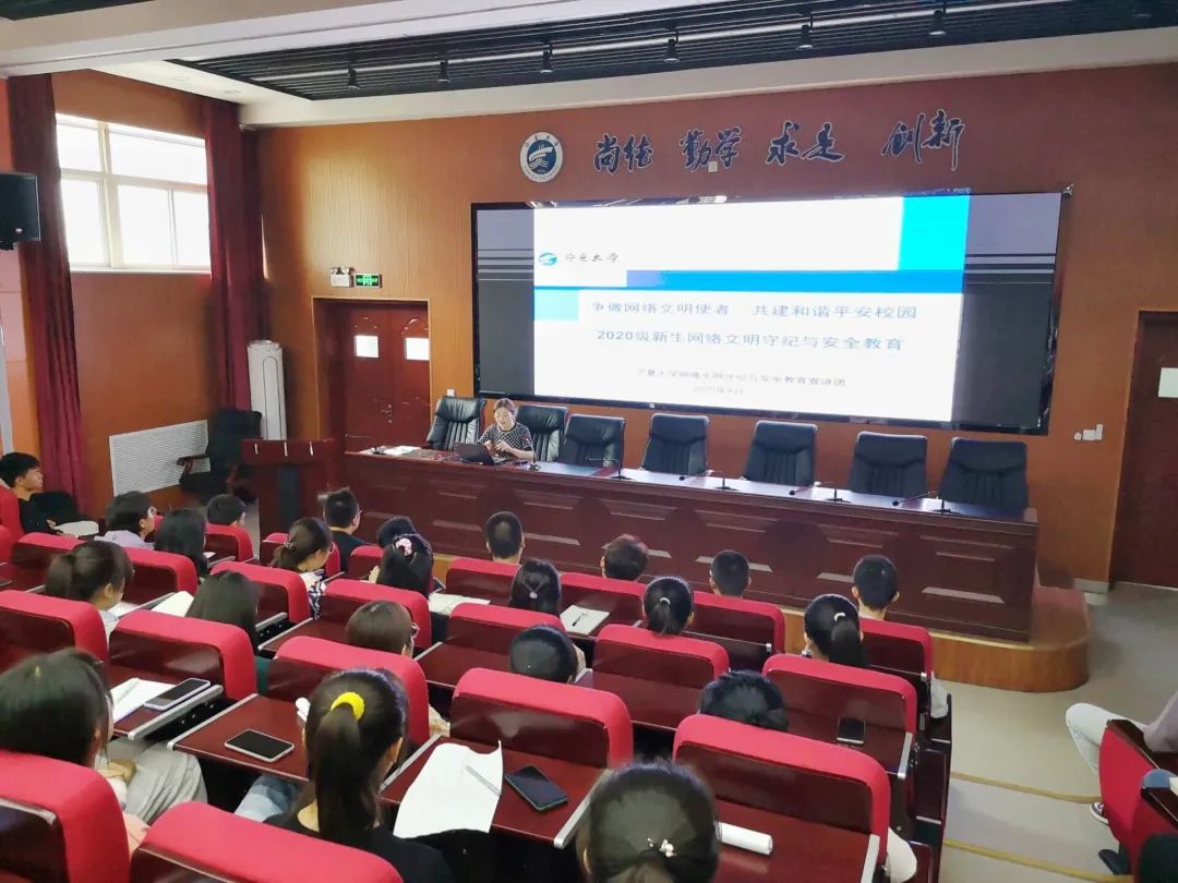 2020年9月14日,williamhill英国于英才报告厅开展网络文明守纪与安全教育讲座。本次讲座由土木与水利工程学院副书记柳宗洁老师主讲,2019级辅导员刘璐老师出席,2020级数学与应用数学(教师教育)一班、二班,应用统计学一班学生参加,数学类一班、二班、三班于线上参加。