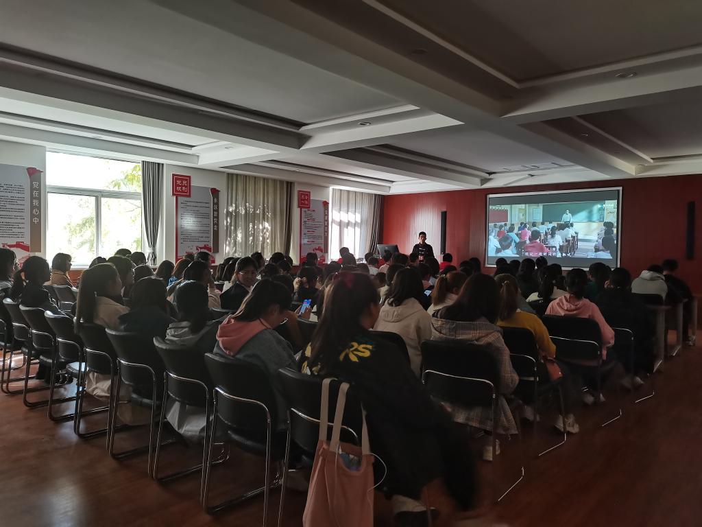 活动伊始,朱智斌同学鼓励2020级的新生同学多参加此类活动,增强自己的教学技能,实现教育梦想并希望大家观完影片能有所感触,有所心得。随后电影«老师.好»正式播放,影片中于谦饰演的老师苗宛秋爱护学生,也不放弃任何一位学生,他教学认真负责,为了让替同学补习的安静不耽误个人复习时间,他晚上免费替同学们补习;他走遍大街小巷,就是想让洛小乙回来上课……随着影片的结束,相信苗宛秋老师为他的学生做的一切打动了在座的每一位观影者,同时也为他们日后成为优秀的教师奠定了基础。