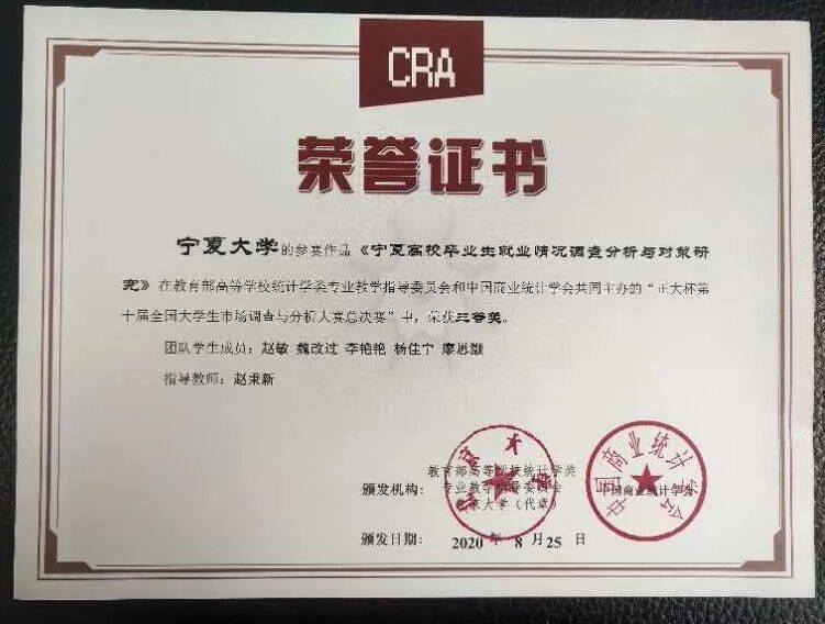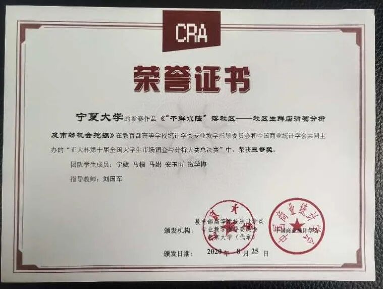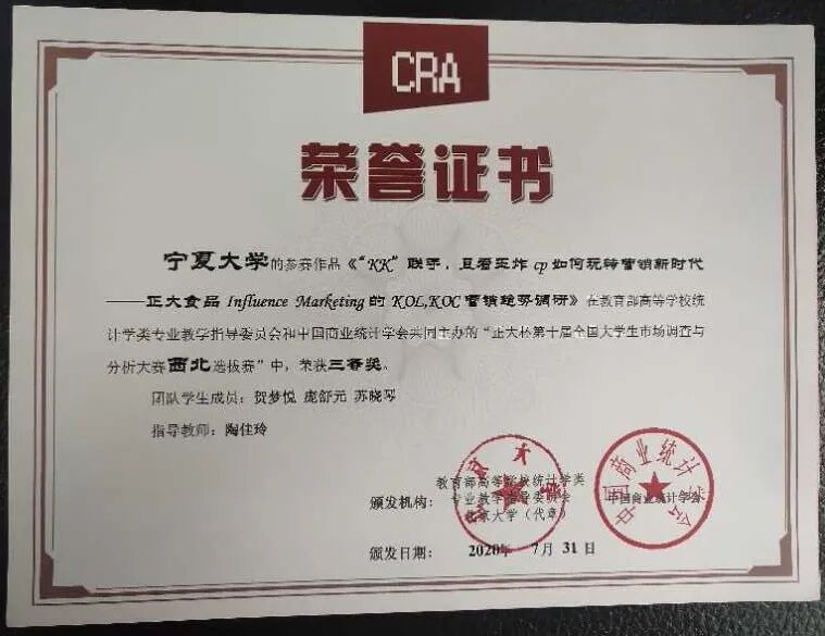 其中,由赵秉新老师指导,赵敏、魏改过、李艳艳、杨佳宁、廖思灏组成的项目团队和刘国军老师指导,宁婕、马楠、马娟、安玉雨、撒学梅组成的项目团队获得“正大杯”第十届全国大学生市场调查与分析大赛总决赛三等奖;汪文帅老师指导,张慧慧、管浩飞、李南荣、王玉照、王明慧组成的参赛小组获得“正大杯”第十届全国大学生市场调查与分析大赛西北选拔赛二等奖;陶佳玲老师指导,贺梦悦、庞舒元、苏晓琴组成的小组获得“正大杯”第十届全国大学生市场调查与分析大赛西北选拔赛三等奖。