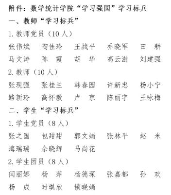 为进一步提高全院师生学习的积极性和参与度,经学院党政联席会研究,分别在教师党员、教师及学生党员、团员中,以“学习积分”排名形式确定学院“学习强国”学习标兵名单。学院决定授予张伟斌等10名教师党员、张现强等10名教师、张之国等8名学生党员和闫丽娜等8名学生团员“学习强国”学习标兵荣誉称号,并予以一定奖励。