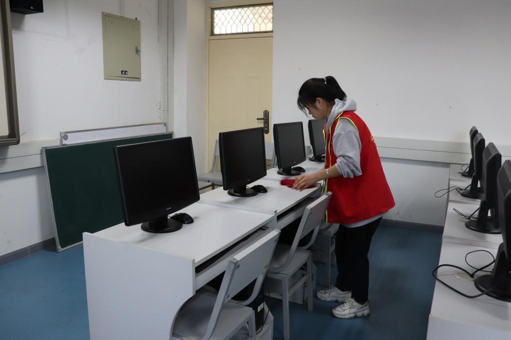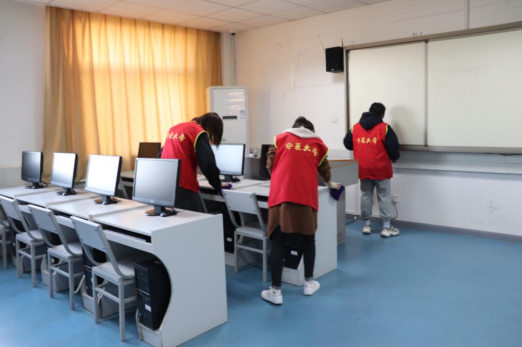 在马千慧同学的带领下,志愿者们前往怀远校区宁远楼各个屋子里面,对里面的物品和学生资料、报刊等进行整理,并且对宁远楼及周围地方的各个角落做了清扫。他们协力清理校道上的杂草、教学楼的垃圾、草坪上的落叶、认真地清理每一个死角,不怕脏、不怕累,弯腰拾物的志愿者们成为了校园里最美的风景。