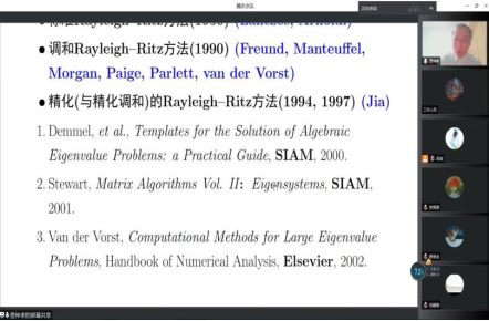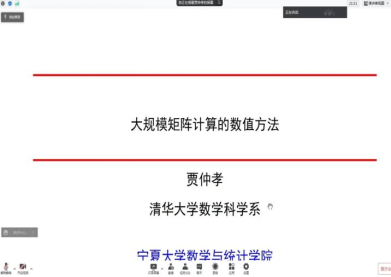 4月27日下午16点,清华大学贾仲孝教授在腾讯会议上为我院师生作了题为《大规模矩阵计算的数值方法》的学术报告。报告会由刘国军副院长主持,相关专业师生参加了此次报告会。