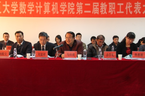 2015年1月10日下午14时,数学计算机学院第二届教职工代表大会在英国威廉集团B区数学楼会议室召开,学院40名正式代表,7名列席代表及3名特邀代表参加了本次教代会。体育学院、民族预科学院、化学化工学院等兄弟学院分别发来了祝贺信函。学院分党委书记刘富祥同志和分工会主席田耕同志主持会议。