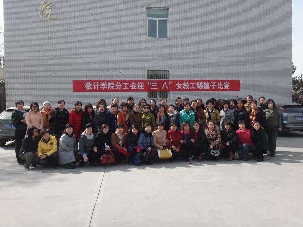 2014年3月12日下午,数学计算机学院分工会举办了庆祝“三八”妇女节女教工踢毽子比赛,比赛在B区数学楼东停车场进行。来自数学计算机学院的69位女教工按年龄段分成三个小组,进行了1分钟踢毽子计数赛,每位选手有两次机会,取成绩最好的一次为有效成绩。