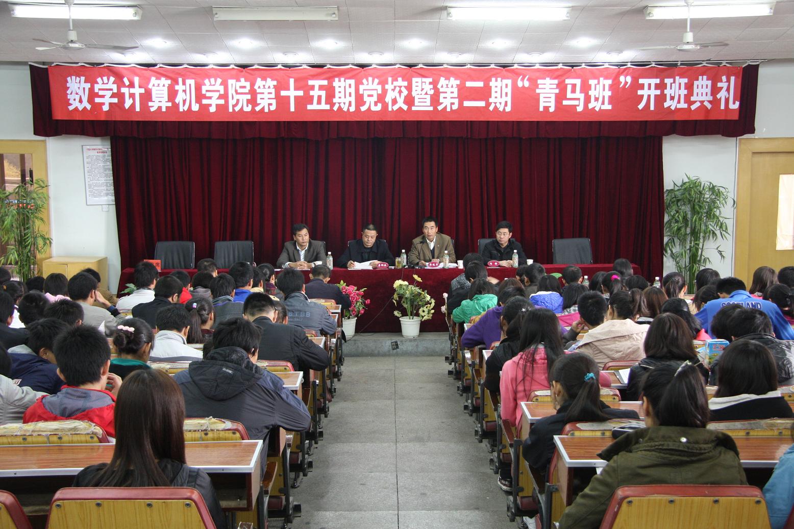 2010年10月31日,数学计算机学院在校本部B区综合楼二楼报告厅隆重举行第十五期党校暨第二期青年马克思主义者培养工程培训班开班典礼。院党总支书记李嗣丞、副书记乔晓军、副院长冯峰,学院各党支部书记及200余名学员参加了开班典礼。开班典礼由党总支副书记纳殿文主持。