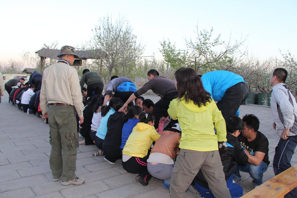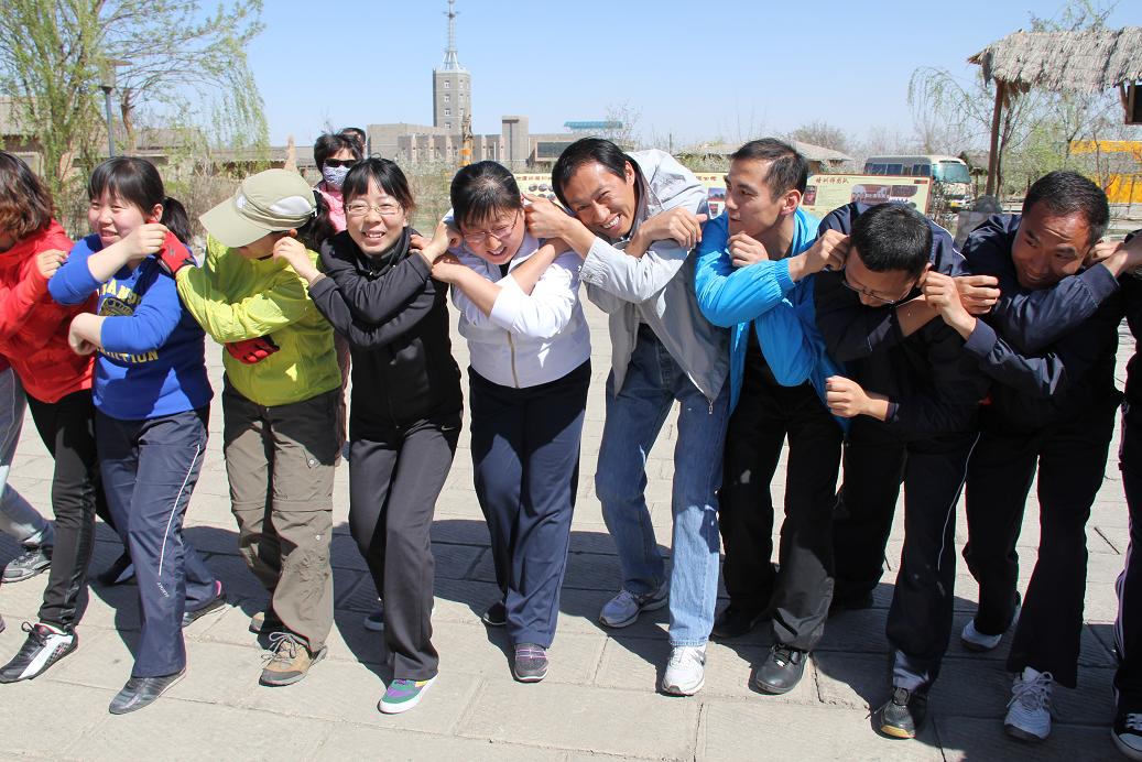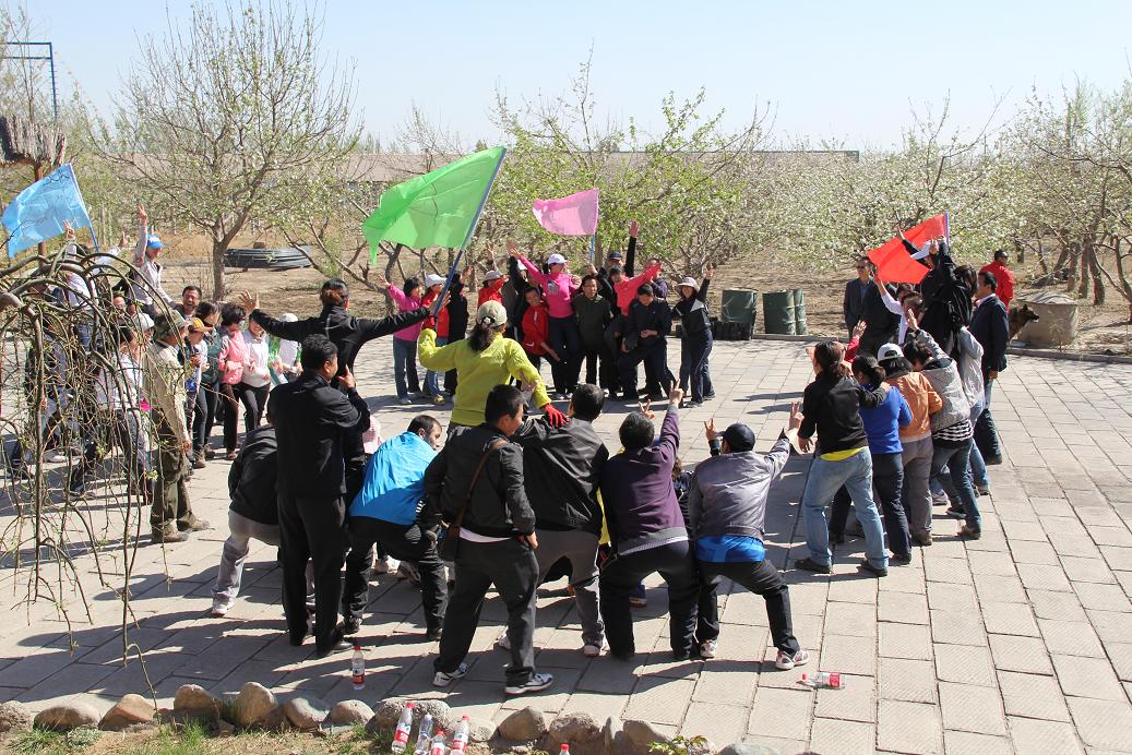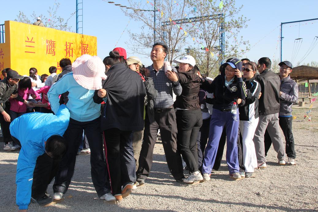 当队伍到达兰一山庄,首先映入眼帘的是盛开着大片的桃花林,处处绿意盎然,一眼望去,心旷神怡,大自然的美使得大家的心情顿时舒畅了,平时工作和生活中的压力猛然间都消失了。来到拓展场地后,各位老师挑战自我的心情迫不及待,蠢蠢欲动。在教官的讲解和指导下,大家一边进行破冰热身活动,一边了解素质拓展的意义和目的。随后,整个队伍被分成了4支挑战队,各队集思广益,为自己的队伍选出了队长、命名了队名、画出了Logo、设计了口号和队歌,各队经过一番激烈的比拼演练后,依次进行了激情传递滚球、泰坦尼克号逃生、强渡金沙江等科目。特别是在强渡金沙江科目中,24位老师踊跃担当了河中的“桥墩”,在严明的规则和限定的时间内,他们强忍着队员们的踩踏,汗水不停的从脸颊流下,一遍又一遍,一个又一个地把队员们运到对岸,粛严、顽强、壮烈的场面十分感人,使许多队员当场禁不住流下了眼泪,特别是最后,当仅剩下5名“桥墩”时,大家都纷涌跳进了“金沙江”,筑起了一道坚固的人桥,使奋战到最后的“勇士”顺利到达彼岸。那一刻,全场沸腾了,大家奔走欢呼,为挑战成功发自肺腑的欢呼,为我们这个协作互助的团队而忘我的欢呼——我们成功了,成功了!在欢呼中我们结束了所有拓展科目。