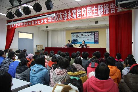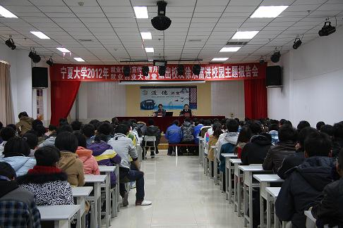 在报告会中,徐永富主席就自己从农场工作到宁大学习,从留校助教到从政工作的切身亲历和同学们进行了热情的交流,话语诙谐,令人寻味。56岁的他总结了他“4加3个17”式的岁月,即他在浙江度过了四年的童年,在宁夏度过了十七年的农垦生活、十七年的宁大生活和17年的从政生活。接着,他与同学们分享了自己的十条人生感悟:一、珍惜善待大学;二、大学短、社会长,小舞台、大延伸;三、文理不严格划界;四、积累拓广见识;五、重视交友选择;六、追求创新;七、担当负责的婚姻;八、训练提高审美;九、理智坦然地入世;十、在人生中防范和躲避风雨。当谈及大学如何面对机遇时,他说,大学生对于每次机遇都应做到有备而为、立足高远,并就他经历的四次机遇与大家做了经验交流。
