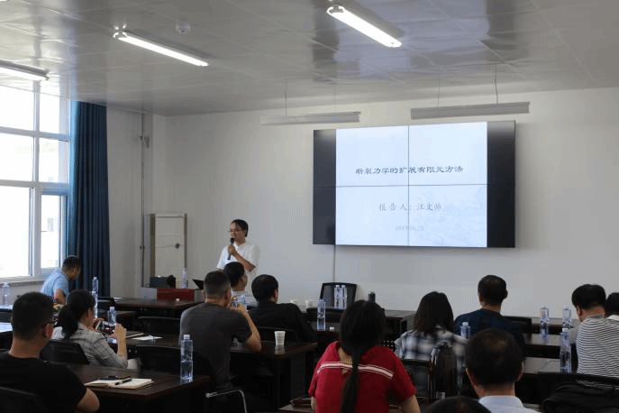数统学院两位教师代表刘智永博士、汪文帅博士和宁夏师范学院数学与计算机科学学院两位教师代表杨纪华博士、常莉红博士交叉作了学术报告。刘智永老师以“径向基函数多尺度配点算法”为题目,系统介绍了基于径向基函数的无网格多尺度配点算法,包括算法的适定性、正则性、稳定性及误差分析等相关理论证明,并讨论了数值实验结果。杨纪华老师作了“Bounding the number of limit cycles of no-smooth differential systems by using Picard-Fuchs equations”的报告,他介绍了将Picard-Fuchs方法推广到求解非光滑微分方程的研究工作,给出了分析证明过程及方法的应用。汪文帅老师作了“断裂力学的扩展有限元方法”的报告,他给出了将扩展有限元方法的理论用于数值模拟断裂力学中的问题,并展示了使用扩展有限元方法对裂纹材料问题和地震波问题的数值模拟结果,对经典算例和曲裂纹模型给出了模拟结果。常莉红老师的报告题目是“融合放过发的研究及其在图像处理中的应用”,她利用态叠加的分数阶傅立叶变换、图像分解、卷积稀疏表示、神经网络和低秩稀疏理论讨论了融合方法在图像去噪和多源图像中的应用。与会老师仔细聆听,认真记录,现场提出了许多问题,主讲老师们都一一进行了解答,并参与了现场讨论。