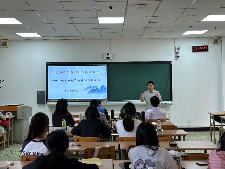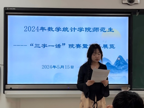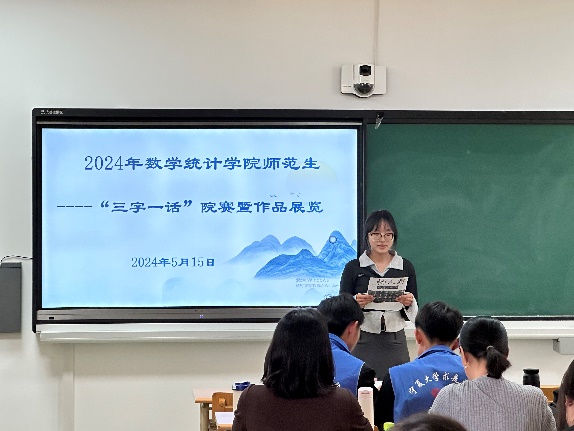 为了夯实师范生“钢笔字、毛笔字、粉笔字和普通话”教学基本功。2024年5月15日下午,学院联合求是书院团委、数学统计专业学生党支部,在贺兰山校区兰山一教C401室举办了数学专业师范生“三字一话”基本功大赛。比赛邀请到学院数学教工党支部王丽、苏克义、秦君琴、文晓霞四位老师担任评委。