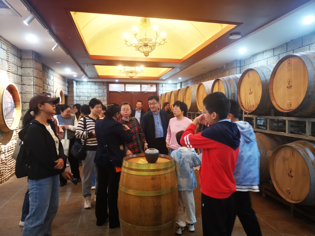 来到玉泉国际酒庄,在解说员的介绍下,老师们了解了葡萄种植产业、参观了葡萄酒酿造过程、品尝了酿酒葡萄和美味的红葡萄酒。