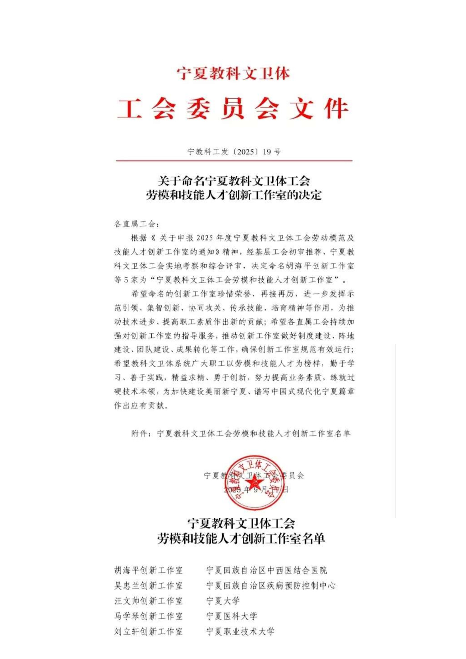 近日,宁夏教科文卫体工会委员会发布宁教科工发〔2025〕19号文件,公布了“宁夏教科文卫体工会劳模和技能人才创新工作室”名单,我院汪文帅教授领衔的“汪文帅创新工作室”成功入选。