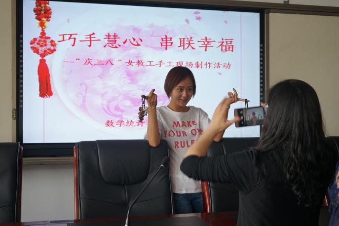 3月14日下午两点,为庆祝2018年度“三八妇女节”,数学统计院在学院楼413会议室举办了“巧手慧心,串联幸福”的女教工现场手工制作活动。此次活动主要由三位指导教师带领教职工分别制作杯垫与钥匙挂件等小手工制品,学院40多名女教职工参与此次活动。