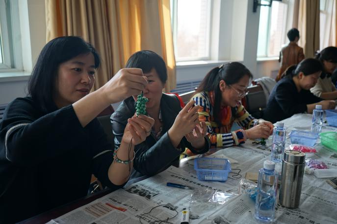 智慧在指尖流转,心灵在珠子间跳跃,每一位教职工都在制作中细心听取指导老师的讲解,认真学习手法与搭配,力争将这一颗颗色彩艳丽的珠子有规律地组合成自己满意的效果。三个小时的互动交流制作时间很快过去了,在互帮互助中,大家手中杂乱无序的珠子都整整齐齐的排列成一件件精美的工艺品,老师们仍然意犹未尽,纷纷表示以后还要挑战更加复杂的作品。
