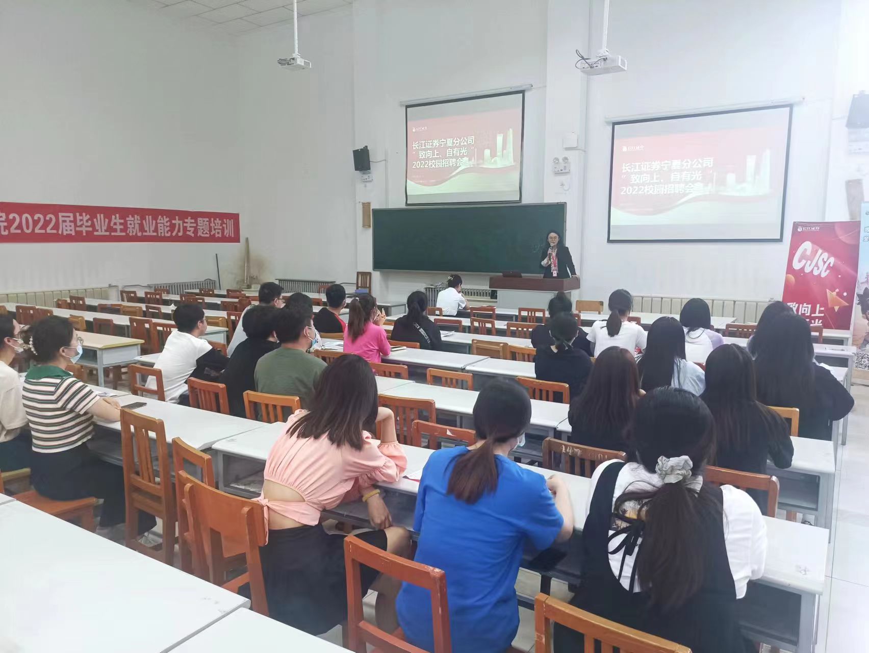 为增加我院2022届毕业生就业机会,为他们提供更过的就业选择,5月25日下午7时,williamhill英国于金凤校区大学生活动中心举行长江证券宁夏分公司“致向上,自有光”2022届毕业生校园招聘会。本次招聘会由长江证券宁夏分公司相关人员进行宣讲,我院2022届部分毕业生参与。