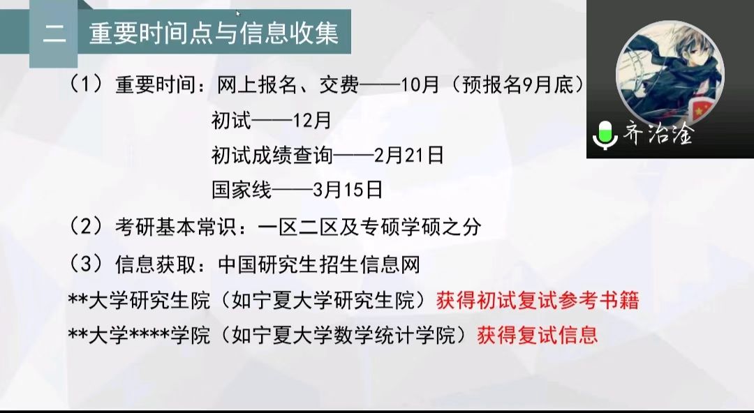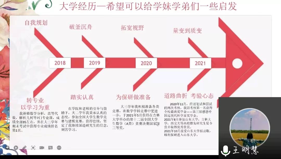 2022年4月12日,我院邀请六位成功上岸的同学于腾讯会议进行线上“考研保研宣讲交流会”,为大家分享了科学的学习方法、成功的备考经验,还解答大家在备考过程中遇到的问题和困惑、帮助同学们了解考研与保研具体情况。本次分享会为有志于读研或不清楚自身是否适合读研的同学提供了很大的帮助,有助于备考的同学深入了解攻读硕士研究生的内容,为同学们的学业计划提供了可行的建议,更是助推同学们高效备考。