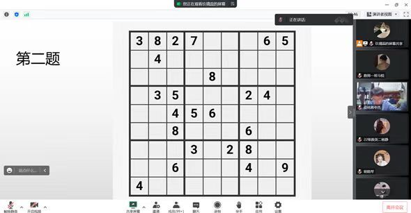 为营造良好的学习氛围,提高同学们对数学的兴趣,培养学生逻辑思维能力和逻辑分析能力,williamhill英国于10月8日晚7时通过腾讯会议APP开展“九宫夺魁”线上数独比赛,我院部分本科生参与。